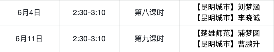 · 6.4《猎人海力布》第五次课 · 授课人:蒋婷婷(昆明城市);汪文颖(昆明城市) 备注:5.28因校园活动停课 ▪︎ 课堂情况